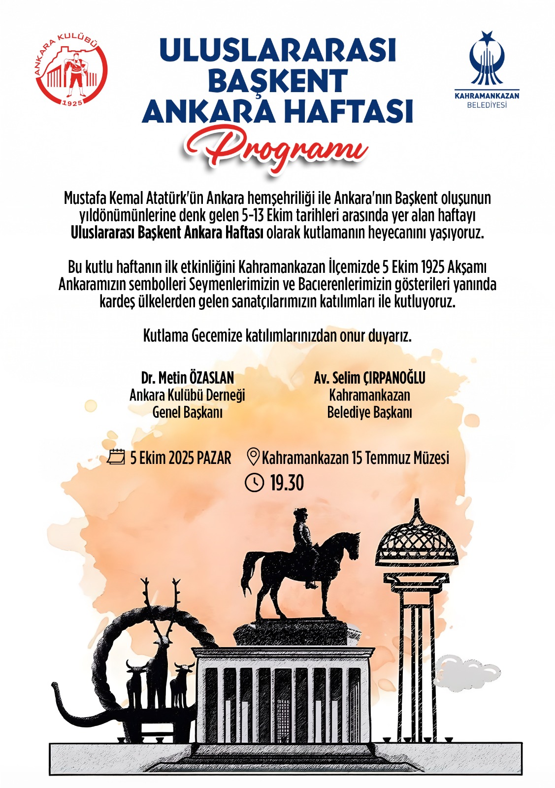 Uluslararası Başkent Ankara Haftası Görkemli Bir Etkinlikle Başlıyor! Ankara'nın başkent oluşunun ve Gazi Mustafa Kemal Atatürk’ün Ankara hemşehriliğini kabul edişinin yıl dönümü münasebetiyle her yıl düzenlenen Uluslararası Başkent ...