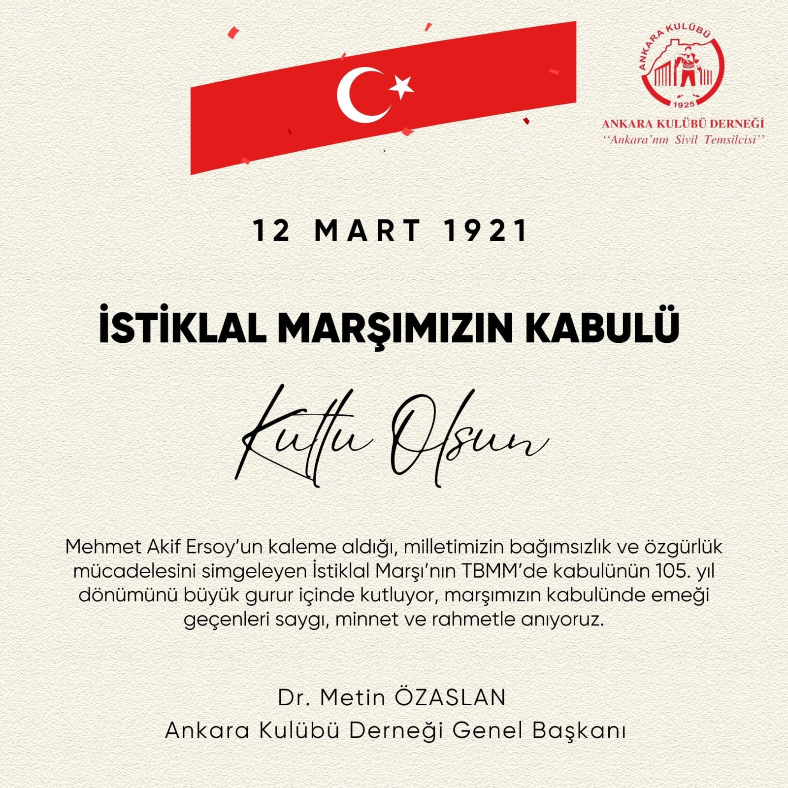 Mehmet Akif Ersoy’un kaleme aldığı, milletimizin bağımsızlık ve özgürlük mücadelesini simgeleyen İstiklal Marşı’nın TBMM’de kabulünün 105. yıl dönümünü büyük gurur içinde kutluyor, marşımızın kabulünde emeği geçenleri saygı, minnet ve rahmetle anıyoruz.